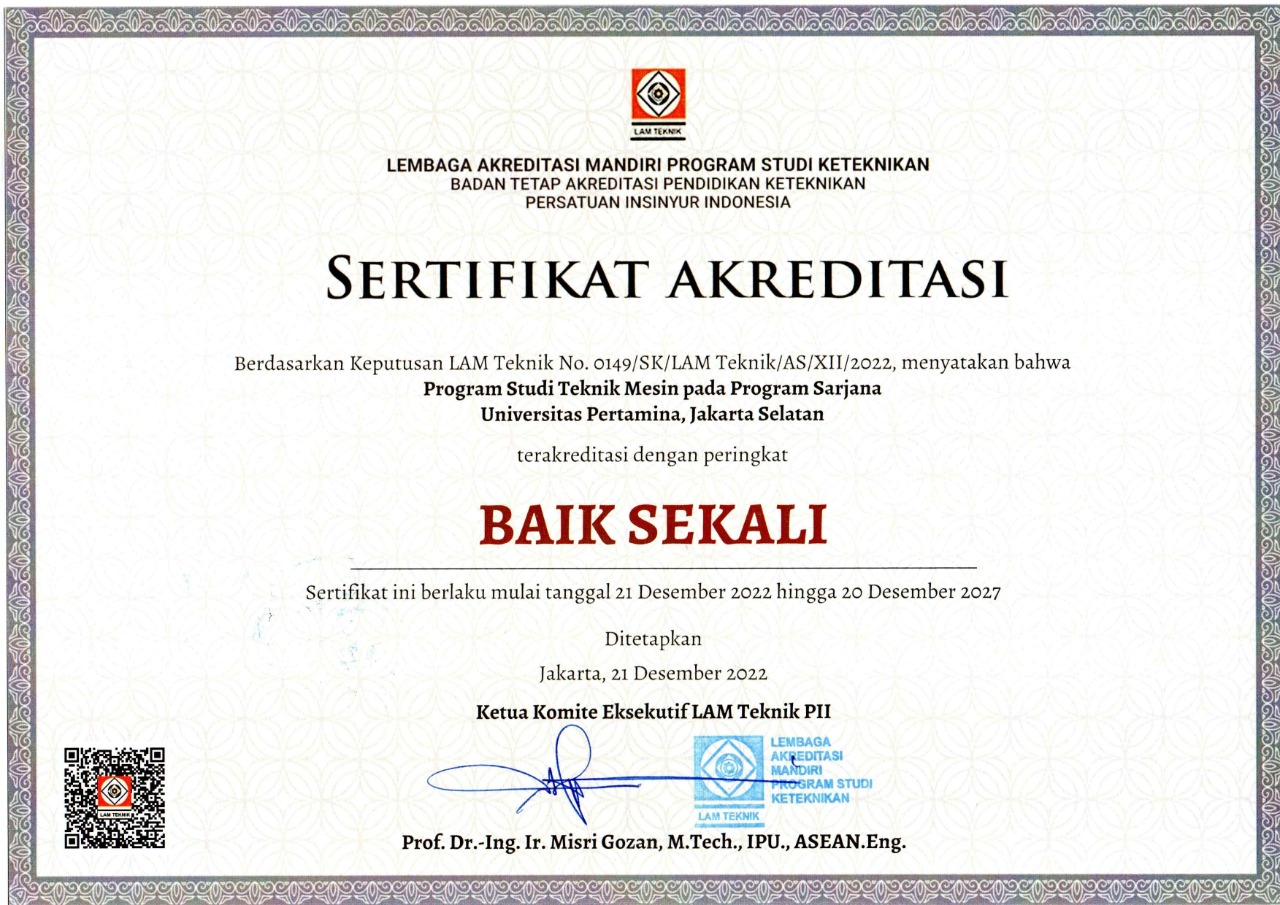 DelikAsia.com, (Universitas Pertamina),–Program Studi Teknik Mesin meraih akreditasi “Baik Sekali” setelah melewati rangkaian penilaian atau proses akreditasi yang dilakukan oleh Lembaga Akreditasi Mandiri Program Studi Keteknikan (LAM Teknik) pada 2-5 November 2022 lalu.(25/12/’22).