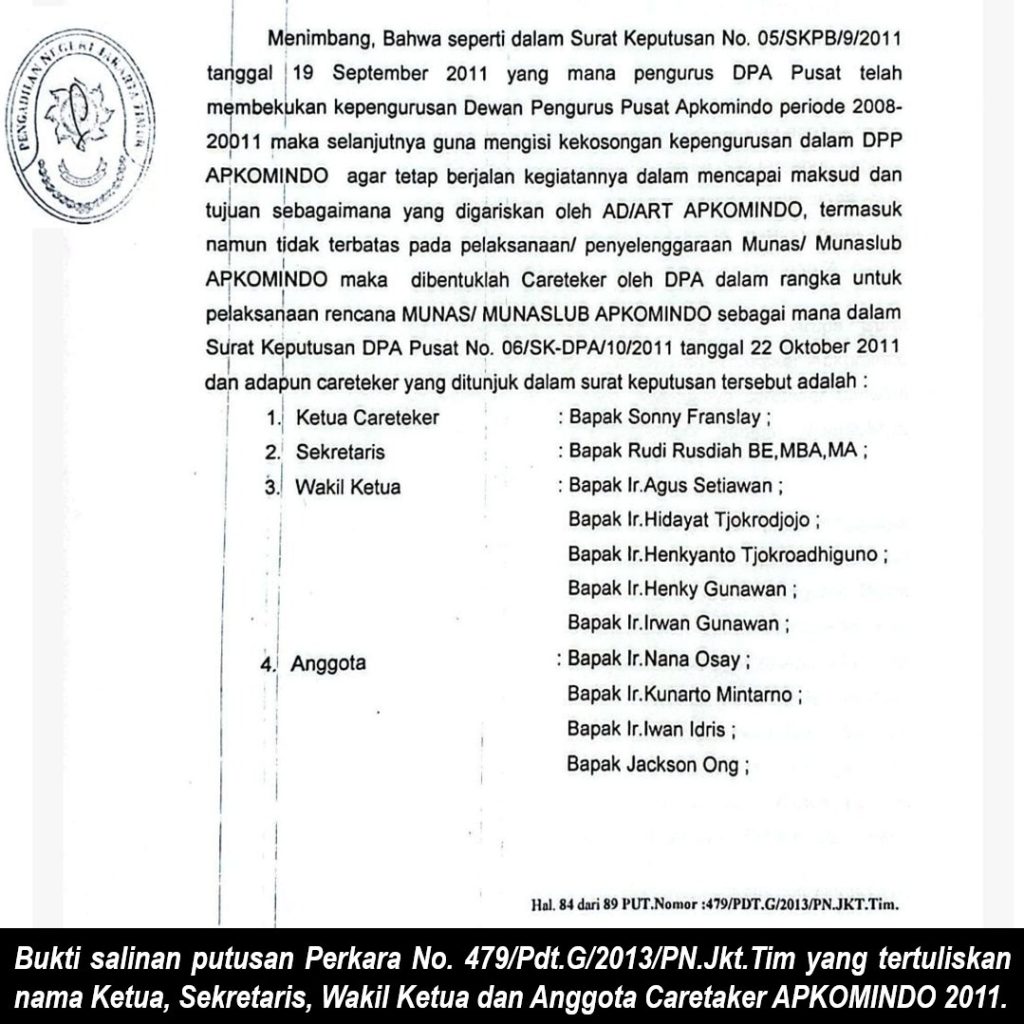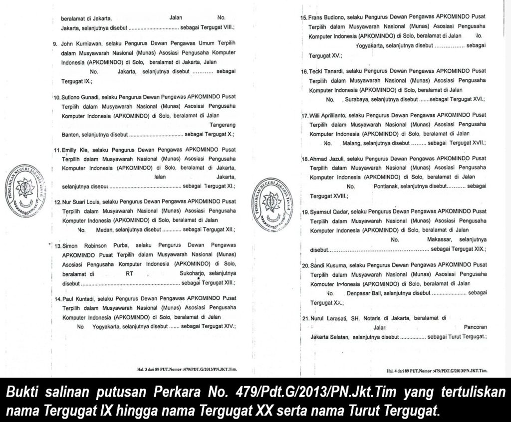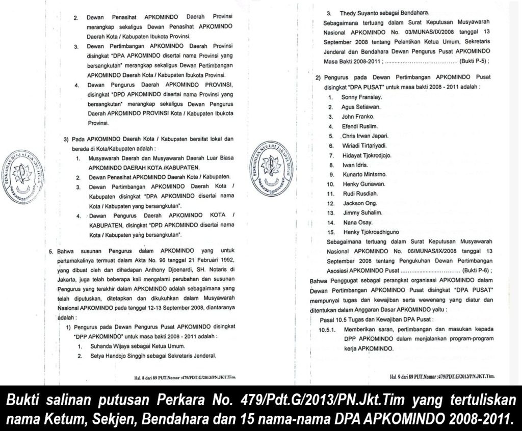 Dalam salinan putusan perkara tersebut, juga tercantum nama-nama Dewan Pertimbangan Asosiasi APKOMINDO masa bakti 2008-2011, yaitu: Sonny Franslay, Agus Setiawan, John Franco, Efendi Ruslim, Chris Irwan Japari, Wiriadi Tirtariyadi, Hidayat Tjokrodjojo, Iwan Idris, Kunarto Mintarno, Henky Gunawan, Rudi Rusdiah, Jackson Ong, Jimmy Suhalim, Nana Osay, dan Henky Tjokroadhiguno.