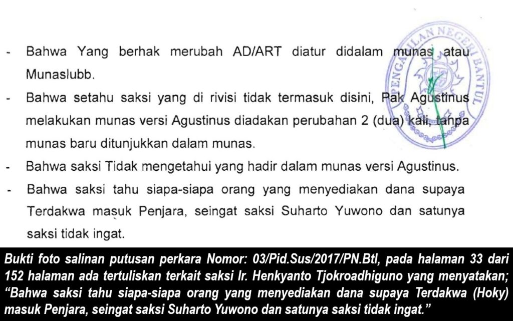 Justru dalam persidangan tersebut terungkap ada yang menyiapkan dana agar Hoky masuk penjara, salah satu nama orang yang menyiapkan dana adalah Suharto Yuwono, keterangan tersebut disampaikan oleh Saksi Ir. Henkyanto Tjokro Adhiguno dan ada tertuliskan dalam salinan putusan perkara tersebut.