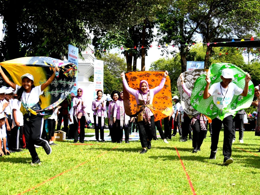 Seperti mengenang masa kecil, Ibu Negara, Ibu Wury Ma’ruf Amin, dan Ibu-Ibu OASE-KIM berbaur dengan anak-anak dan ikut bermain dengan gembira di halaman Pendopo Sabha Swagata komplek Rumah Dinas Bupati Banyuwangi. Ibu Negara beserta rombongan membersamai anak-anak bermain ular naga, patheng dudu, engklek, bola bekel, babalonan sarung, kuartet Banyuwangi hingga melukis layang-layang, hingga memberikan semangat bagi peserta final lomba egrang batok.
