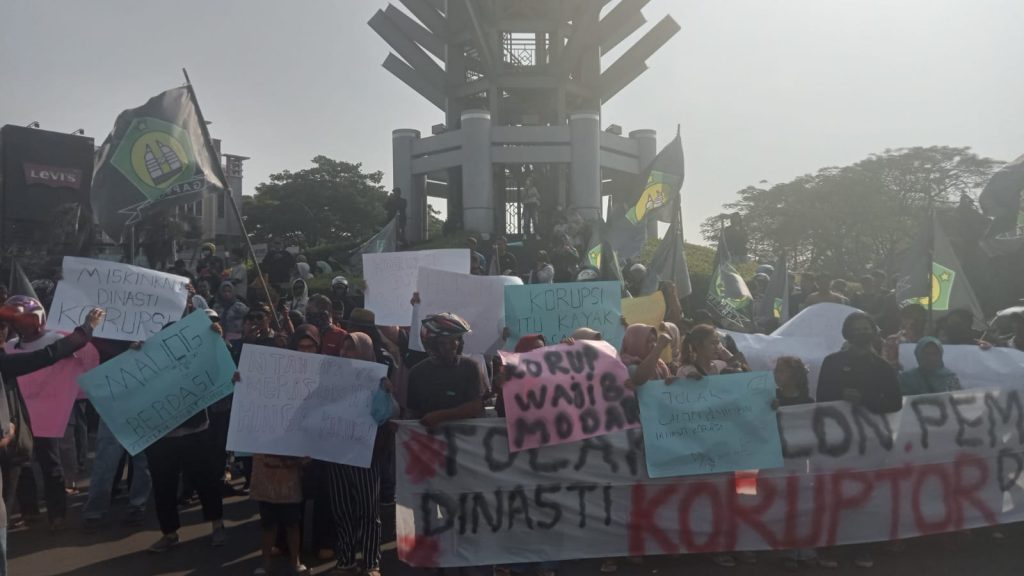 Adapun aksi tersebut menerjunkan 300 massa di Bundaran LandMark Kota Cilegon dengan dentuman lantang suara penolakan untuk calon pemimpin berangkat dari dinasti koruptor di kancah Pilkada Banten 2024.