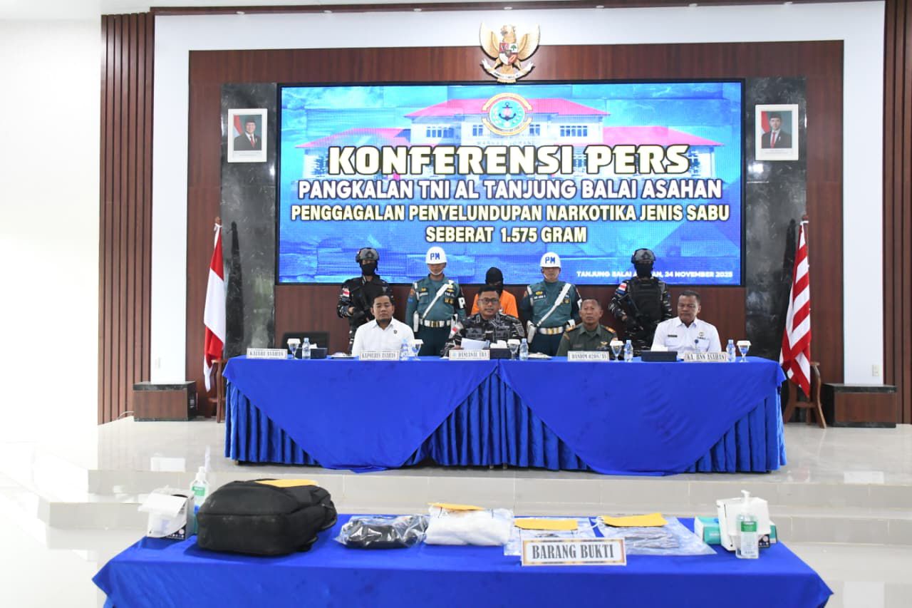 Jakarta, (Delik Asia) | Tim gabungan TNI AL beserta Tim Fleet Quick Response Lanal Tanjung Balai Asahan kembali menunjukkan komitmennya dalam memberantas kejahatan narkotika di wilayah perairan Indonesia dengan menggelar konferensi pers tentang penggagalan upaya penyelundupan narkoba jenis sabu seberat 1.575 gram yang dipimpin oleh Komandan Lanal Tanjung Balai Asahan Letkol Laut (P) Agung Dwi H.D., M.Tr.Opsla., CTMP. di Mako Lanal Tanjung Balai Asahan, Senin (24/11).
