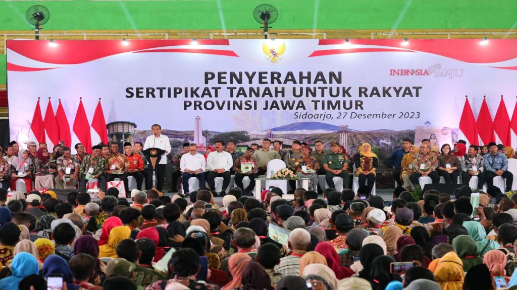 DelikAsia.com, (Sidoarjo) | Presiden Republik Indonesia (RI), Joko Widodo didampingi Menteri Agraria dan Tata Ruang/Kepala Badan Pertanahan Nasional (ATR/BPN), Hadi Tjahjanto menyerahkan 4.000 sertipikat di GOR Delta Sidoarjo, Jawa Timur, pada Rabu (27/12/2023). Sertipikat yang diserahkan terbagi atas 3.200 sertipikat hasil program Pendaftaran Tanah Sistematis Lengkap (PTSL) dan 800 sertipikat Redistribusi Tanah yang dilaksanakan Kantor Wilayah (Kanwil) BPN Provinsi Jawa Timur.
