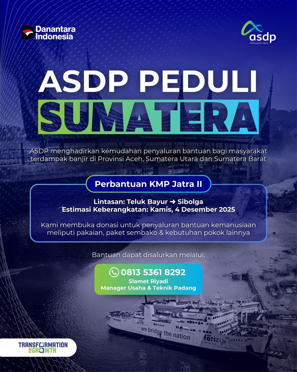 Di sisi lain, Divisi TJSL ASDP dan Cabang terdampak di Sumatera bersama regulator, PT Pelindo dan seluruh mitra BUMN tengah menyiapkan posko tanggap darurat terpusat di Pelabuhan Teluk Bayur, Padang. Beragam bantuan—mulai dari sembako, material dasar, hingga perlengkapan evakuasi—telah dan terus disalurkan, sekaligus mendukung operasional cabang-cabang ASDP yang wilayah kerjanya turut terkena dampak.