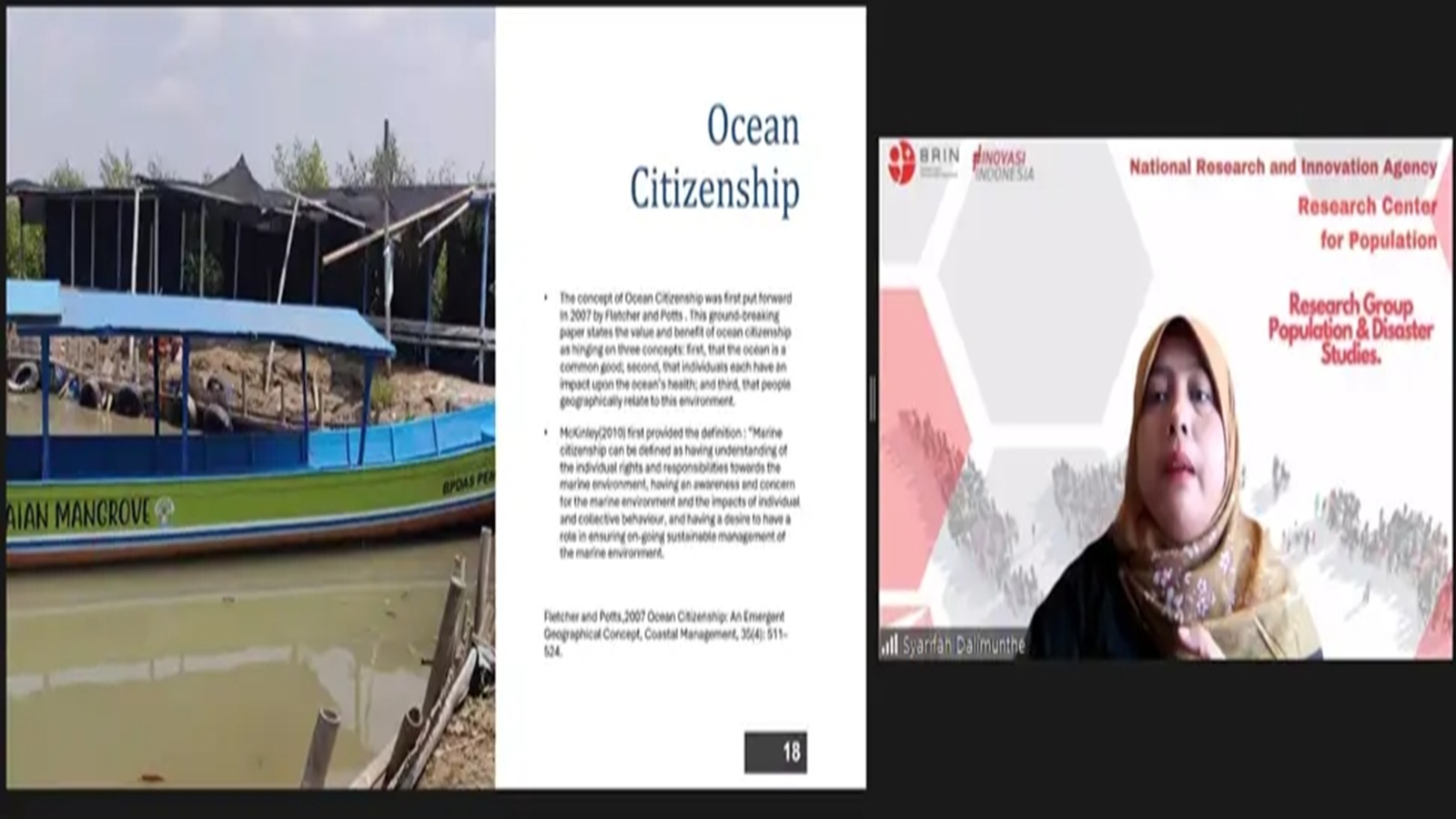 Selanjutnya, Peneliti PRK BRIN Syarifah A. Dalimunthe mengungkapkan, untuk mewujudkan blue citizenship, atau terwujudnya laut yang sehat yang mendukung kesejahteraan penduduk di sekitarnya, perlu ada dorongan ocean literacy untuk disertakan dalam berbagai kurikulum.