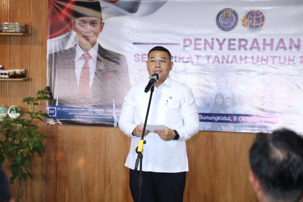 Delik Asia, (Gunungkidul) | Kementerian Agraria dan Tata Ruang/Badan Pertanahan Nasional (ATR/BPN) bersinergi dengan banyak pihak untuk mendorong percepatan pendaftaran tanah di Indonesia. Kolaborasi itu salah satunya menghasilkan sertipikat tanah, termasuk sertipikat yang diserahkan Wakil Menteri (Wamen) ATR/Wakil Kepala (Waka), Ossy Dermawan, di Kabupaten Gunungkidul pada Rabu (08/10/2025).