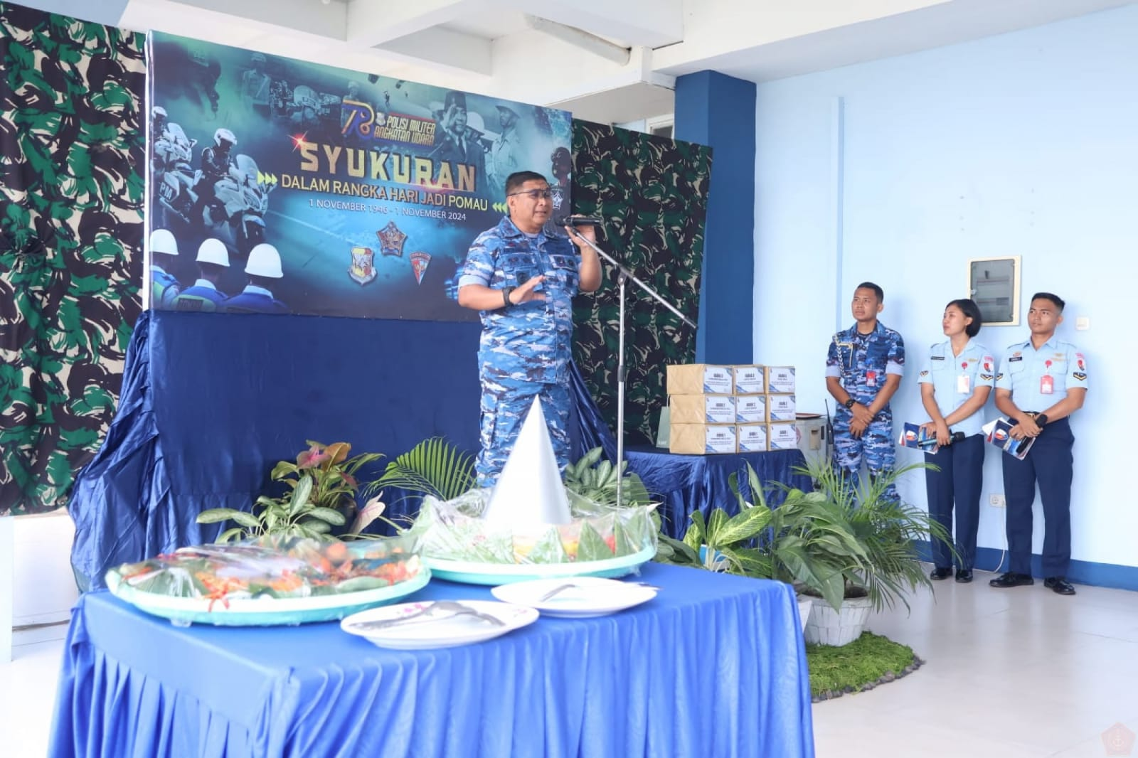 Dalam acara ini, dilakukan pemotongan tumpeng sebagai wujud rasa syukur sekaligus mendoakan agar dengan semangat Wira Waskita, Pomau senantiasa siap mendukung terwujudnya TNI Angkatan Udara yang AMPUH menuju Indonesia Maju.
