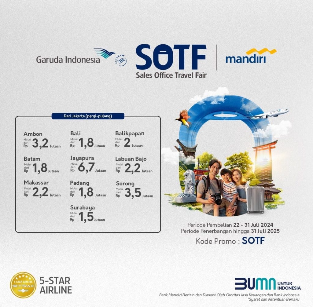 Melalui penyelenggaraan SOTF ini, berkerja sama dengan Bank Mandiri sebagai bank partner, Garuda Indonesia menghadirkan penawaran menarik berupa diskon tiket perjalanan hingga mencapai 80% untuk menuju berbagai destinasi penerbangan domestik maupun internasional serta tambahan cashback dari Bank Mandiri untuk periode perjalanan 22 Juli 2024 – 31 Juli 2025.