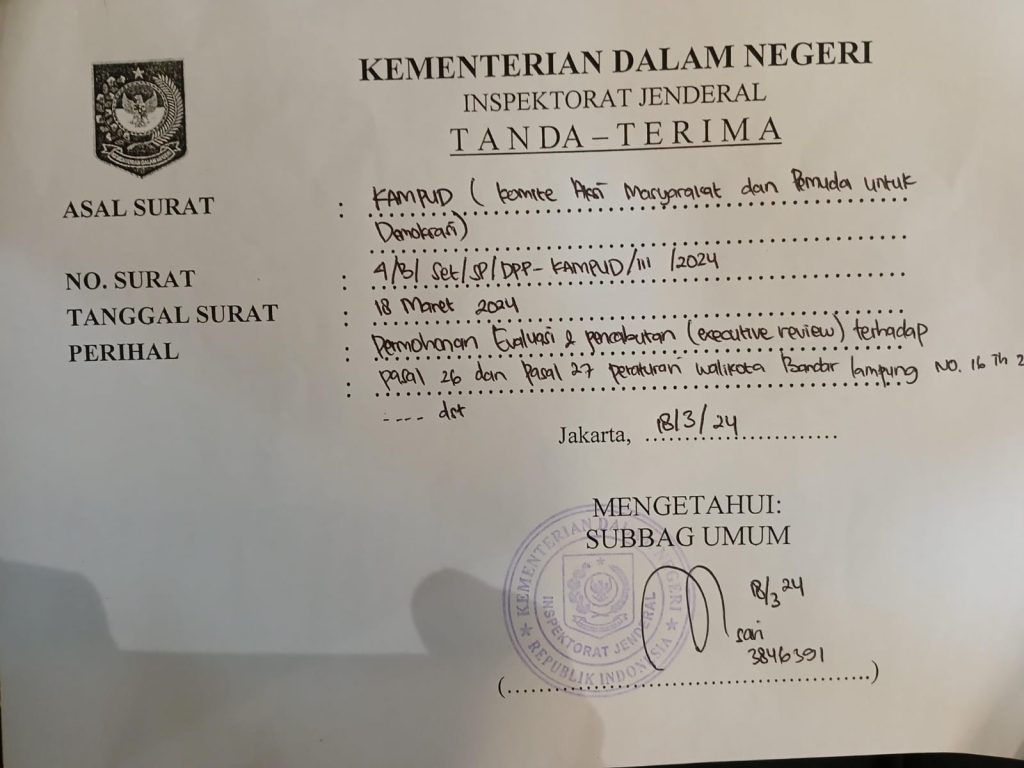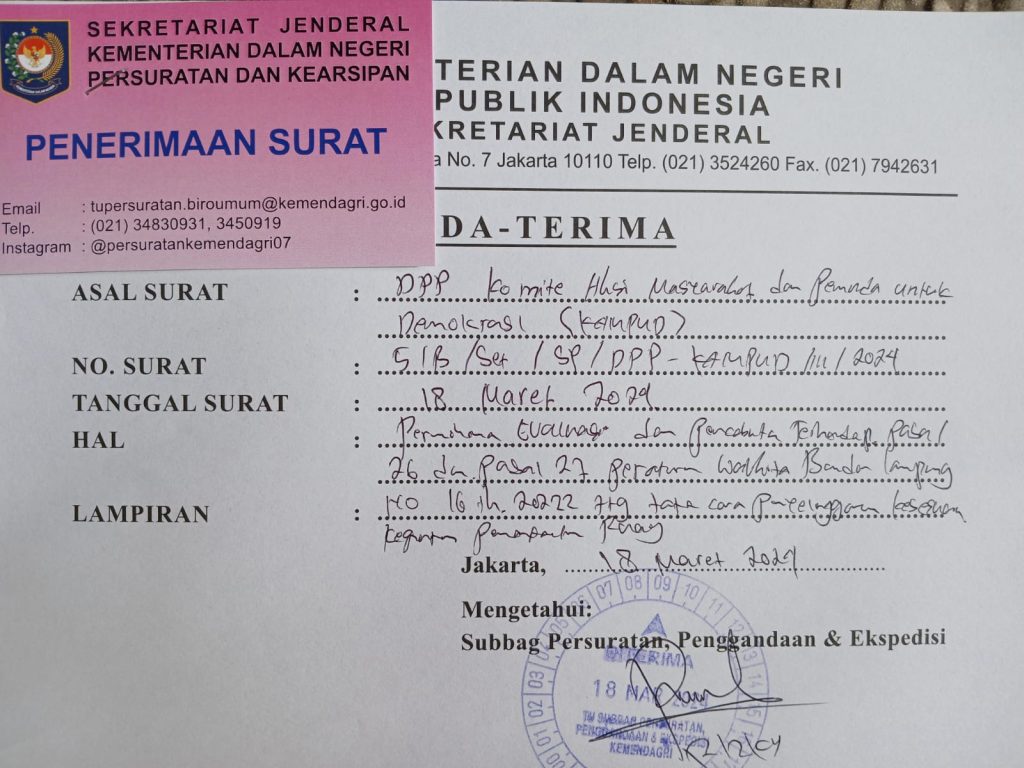 Dokumentasi: Dewan Pimpinan Pusat (DPP) Komite Aksi Masyarakat dan Pemuda Untuk Demokrasi (KAMPUD), saat melayangkan surat permohonan kepada Pemerintah Pusat diantaranya Presiden RI, Menteri Dalam Negeri RI, Inspektur Jenderal Kementerian Dalam Negeri, dan Menteri Pekerjaan Umum dan Perumahan Rakyat (PUPR), DelikAsia.com, (Lampung) | Dewan Pimpinan Pusat (DPP) Komite Aksi Masyarakat dan Pemuda Untuk Demokrasi (KAMPUD) melayangkan surat permohonan kepada Pemerintah Pusat diantaranya Presiden RI, Menteri Dalam Negeri RI, Inspektur Jenderal Kementerian Dalam Negeri, dan Menteri Pekerjaan Umum dan Perumahan Rakyat (PUPR), adapun surat tersebut perihal permohonan evaluasi dan pencabutan atas peraturan Walikota (Perwali) Bandar Lampung nomor 16 tahun 2022 tentang tata cara penyelenggaraan kesesuaian kegiatan pemanfataan ruang (KKPR) yang dinilai tidak sejalan dan/atau bertentangan dengan Peraturan Menteri PUPR nomor 20/PRT/M/2019 tentang kemudahan dan bantuan pemilikan rumah bagi masyarakat berpenghasilan rendah, dan Keputusan Menteri PUPR nomor 242/KPTS/M/2020 tentang batasan penghasilan kelompok sasaran kredit/pembiayaan/pemilikan rumah bersubsidi besaran suku bunga, pembiayaan bersubsidi, lama masa subsidi dan jangka waktu kredit pemilikan rumah, batasan harga jual rumah umum tapak dan satuan rumah susun umum, batasan luas tanah dan luas lantai rumah umum tapak, luas lantai satuan rumah susun umum serta besaran subsidi bantuan uang muka perumahan, pada Senin (18/3/2024).