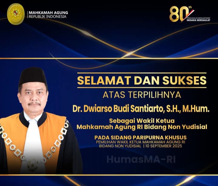 Hakim Agung Dr. Dwiarso Budi Santiarto, S.H., M.Hum. resmi terpilih sebagai Wakil Ketua Mahkamah Agung (MA) Bidang Non Yudisial dalam Sidang Paripurna Khusus Pemilihan yang digelar di ruang Kusumah Atmadja Mahkamah Agung, Rabu (10/9).