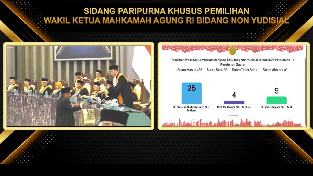 Hasilnya, Dwiarso meraih 25 suara sah, unggul atas Prof. Hamdi dan Dr. Prim Haryadi. Dengan demikian, ia ditetapkan sebagai Wakil Ketua MA Bidang Non Yudisial terpilih.