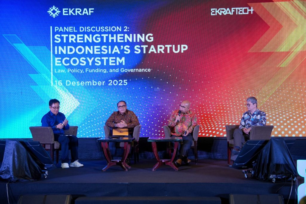 Caption: Diskusi panel kedua dengan tajuk Strengthening Indonesia’s Startup Ecosystem: Law, Policy, Funding and Governance dalam acara Ekraf Tech Summit 2025 yang berlangsung di Hotel Pullman, Jakarta, Selasa (16/12/2025). Jakarta, (Delik Asia) | Kepastian hukum dan tata kelola yang baik merupakan fondasi kunci untuk membangun ekosistem startup Indonesia yang sehat, inovatif, dan berdaya saing global. Hal ini menjadi sorotan utama dalam diskusi panel kedua EKRAF Summit 2025, yang menekankan bahwa keberhasilan startup, termasuk di sektor smart mobility, tak hanya bergantung pada teknologi, tetapi juga pada ekosistem yang mendukung dengan regulasi yang jelas, penegakan hukum yang konsisten, serta tata kelola perusahaan yang kuat.
