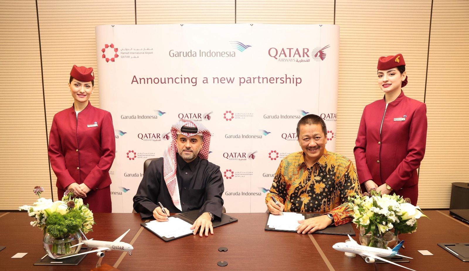 Dokumentasi: Kerja sama penerbangan Jakarta – Doha antara maskapai Garuda Indonesia (kanan) bersama Qatar Airways (kiri), [Foto: Garuda Indonesia]. DelikAsia.com, (Jakarta) | Melalui kerja sama maskapai penerbangan nasional Garuda Indonesia dengan Qatar Airways yang akan bergulir pada 4 April 2024 mendatang, serta akan mengoperasikan rute penerbangan Jakarta – Doha pp.