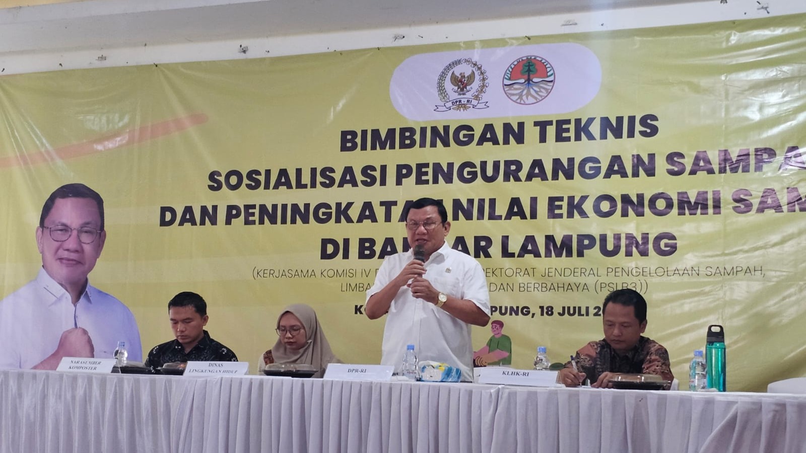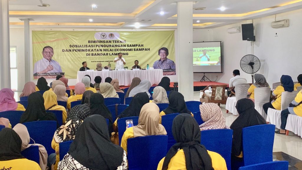 Caption: Anggota DPR RI Hanan A. Rozak bekerja sama dengan Kementrian Lingkungan Hidup dan Kehutanan, saat menggelar bimbingan teknis (Bimtek) dan sosialisasi pengelolaan, pengurangan dan peningkatan nilai ekonomis sampah selama dua hari di GSG Budaya, Kecamatan Kemiling DelikAsia.com, (Bandar Lampung) | Anggota DPR RI Hanan A. Rozak bekerja sama dengan Kementrian Lingkungan Hidup dan Kehutanan menggelar bimbingan teknis (Bimtek) dan sosialisasi pengelolaan, pengurangan dan peningkatan nilai ekonomis sampah selama dua hari di GSG Budaya, Kecamatan Kemiling, Kota Bandar Lampung, pada Kamis (18/07/2024)
