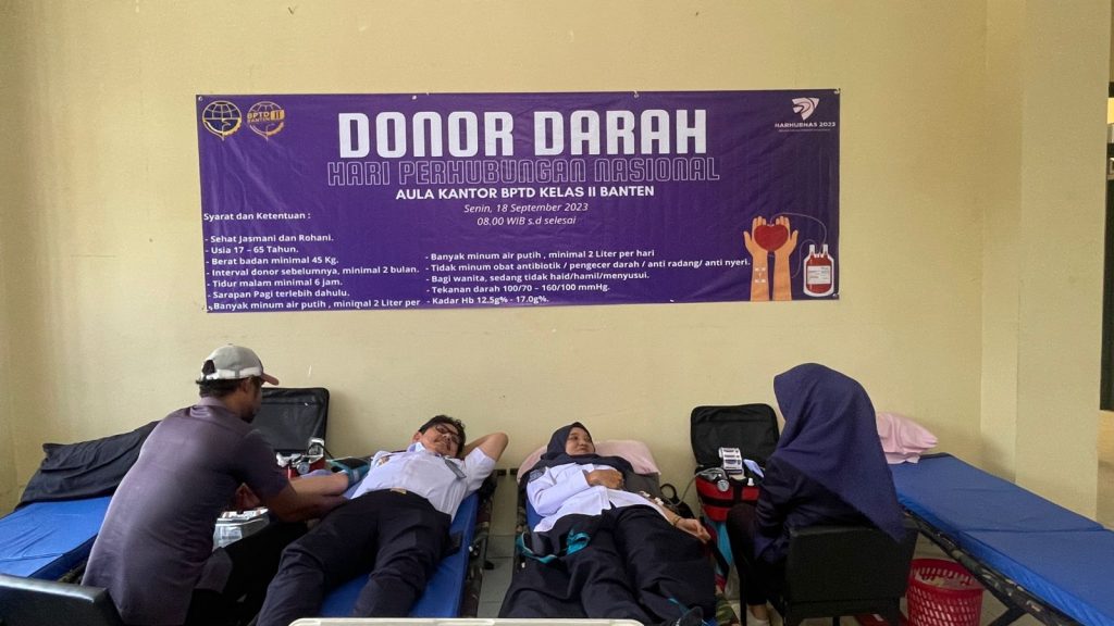 Terpisah pada Kantor BPTD Kls II Banten dilakanakan giat Donor darah yg diikuti oleh selurun insan tranaportaai di merak. Kegiatan ini adalah wujud kepedulian insan perhubungan kepda seluruh masyarakat Indoneaia falam berkontribusi penyiapan bank darah untuk maayarakat.