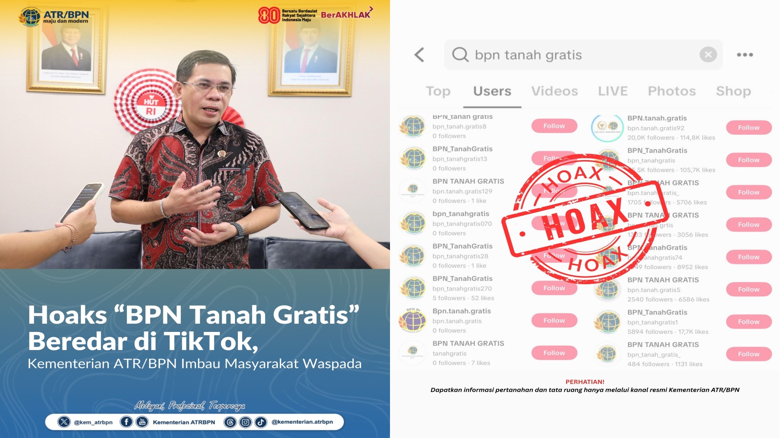 Kepala Biro Hubungan Masyarakat (Humas) dan Protokol, Harison Mocodompis, menyampaikan agar masyarakat berhati-hati terhadap akun media sosial yang tidak jelas sumbernya. “Kami melihat banyak sekali akun TikTok @bpn_tanahgratis beredar. Untuk itu, masyarakat diimbau untuk tidak terpengaruh dengan akun media sosial tidak resmi yang menyebarkan klaim seperti ‘BPN Tanah Gratis’. Informasi dan layanan resmi hanya dapat diperoleh melalui kanal resmi Kementerian, yakni situs atrbpn.go.id dan akun media sosial resmi kami,” tegasnya saat ditemui di Kantor Kementerian ATR/BPN, Jakarta, Selasa (19/08/2025).
