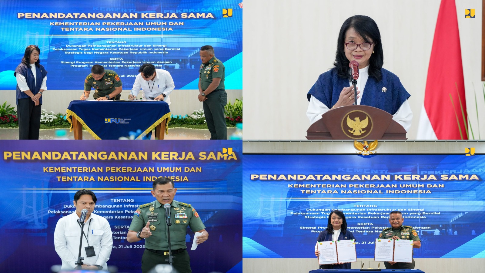 Kerja sama ini diwujudkan melalui penandatanganan Memorandum of Understanding (MoU) antara Menteri PU Dody Hanggodo diwakili Wakil Menteri PU Diana Kusumastuti dengan Panglima TNI Jenderal TNI Agus Subiyanto diwakili Inspektur Jenderal TNI Letnan Jenderal TNI Muhammad Saleh Mustofa di Pendopo Kementerian PU, Senin (21/7/2025).