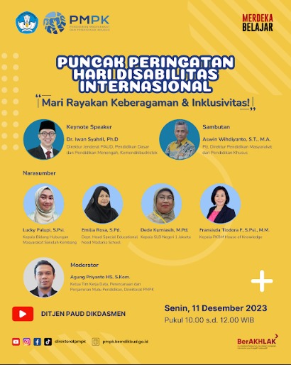 Jakarta, (Jakarta) | Kementerian Pendidikan, Kebudayaan, Riset, dan Teknologi (Kemendikbudristek) melalui Direktorat Pendidikan Masyarakat dan Pendidikan Khusus (PMPK), menyiapkan serangkaian kegiatan dalam memperingati Hari Disabilitas Internasional 2023 pada Senin (11/12). Hari Disabilitas Internasional yang jatuh pada tanggal 3 Desember, menjadi momentum untuk menyemarakkan keberagaman dan inklusivitas pada ekosistem pendidikan. Tema Hari Disabilitas Internasional tahun ini adalah “Mari Rayakan Keberagaman dan Inklusivitas”.