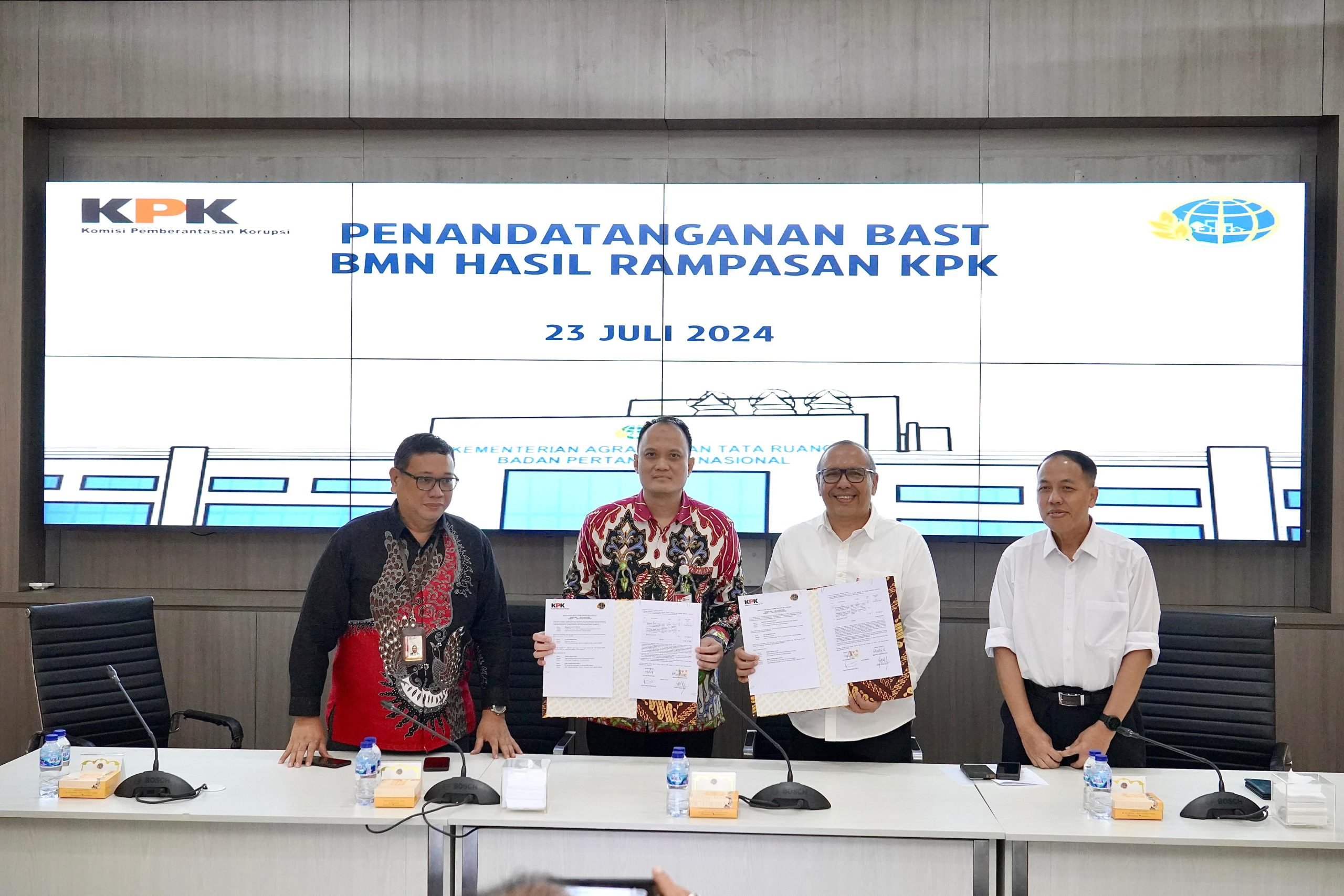 DelikAsia.com, (Jakarta) | Kementerian Agraria dan Tata Ruang/Badan Pertanahan Nasional (ATR/BPN) terima aset Barang Milik Negara (BMN) hasil rampasan Komisi Pemberantasan Korupsi (KPK) dengan total nilai Rp4,78 miliar. Penyerahan ditandai dengan penandatangan Berita Acara Serah Terima (BAST) oleh Sekretaris Jenderal (Sekjen) Kementerian ATR/BPN, Suyus Windayana dan Direktur Pelacakan Aset, Pengelolaan Barang Bukti, dan Eksekusi KPK, Mungki Hadipratikto pada Selasa (23/07/2024).