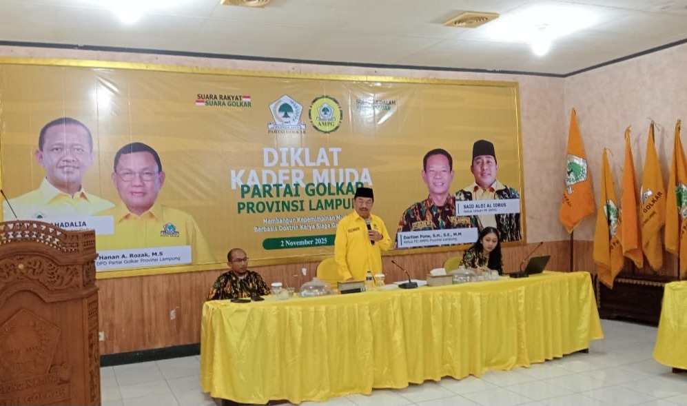 Delik Asia, (Bandar Lampung) | Wakil Ketua Bidang Pemuda dan Olahraga Dewan Pimpinan Daerah (DPD) Partai Golongan Karya (Golkar) Provinsi Lampung sekaligus Ketua Angkatan Muda Partai Golkar (AMPG) Provinsi Lampung, Darlian Pone, S.H, S.E, M.M menggelar acara pendidikan dan pelatihan (Diklat) kader muda Partai Golkar gelombang 1 (satu) dengan mengusung tema, “membangun kepemimpinan muda berbasis doktrin karya siaga gatra praja”, yang dipusatkan di Aula Kantor DPD I Partai Golkar Provinsi Lampung pada 2 November 2025.