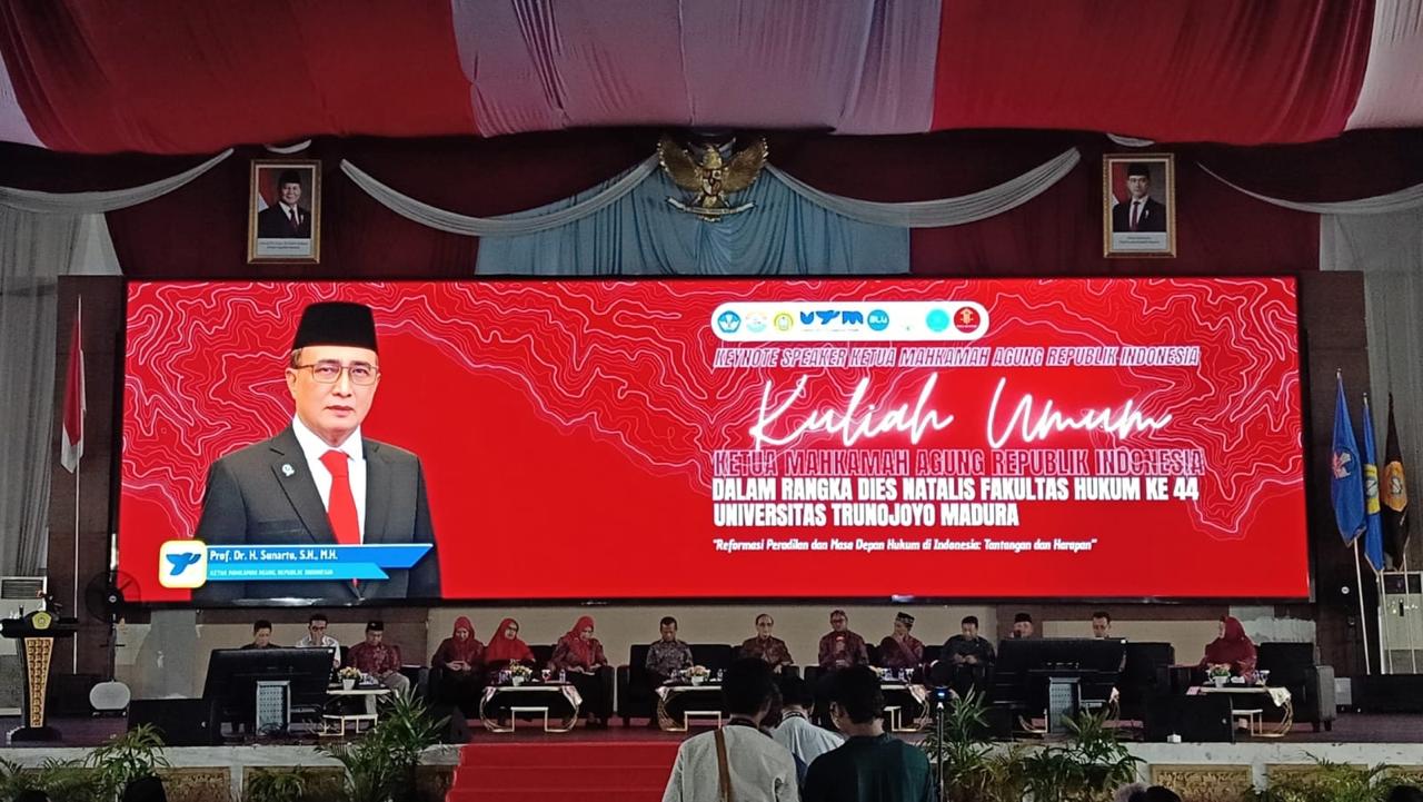 Delik Asia, (Bangkalan) | Ketua Mahkamah Agung (MA) Prof Sunarto menghadiri undangan Universitas Trunojoyo Madura (UTM) Jawa Timur untuk memberikan kuliah umum bertemakan ‘Reformasi Peradilan dan Masa Depan Hukum di Indonesia: Tantangan dan Harapan’. Ia membahas mengenai relevansi integritas dalam segala profesi hakim sebagai tombak utama lembaga peradilan.