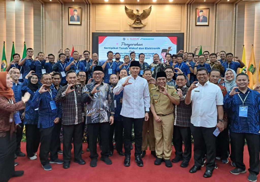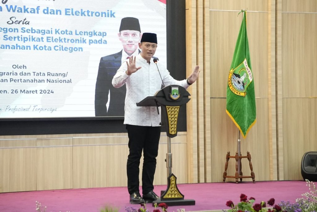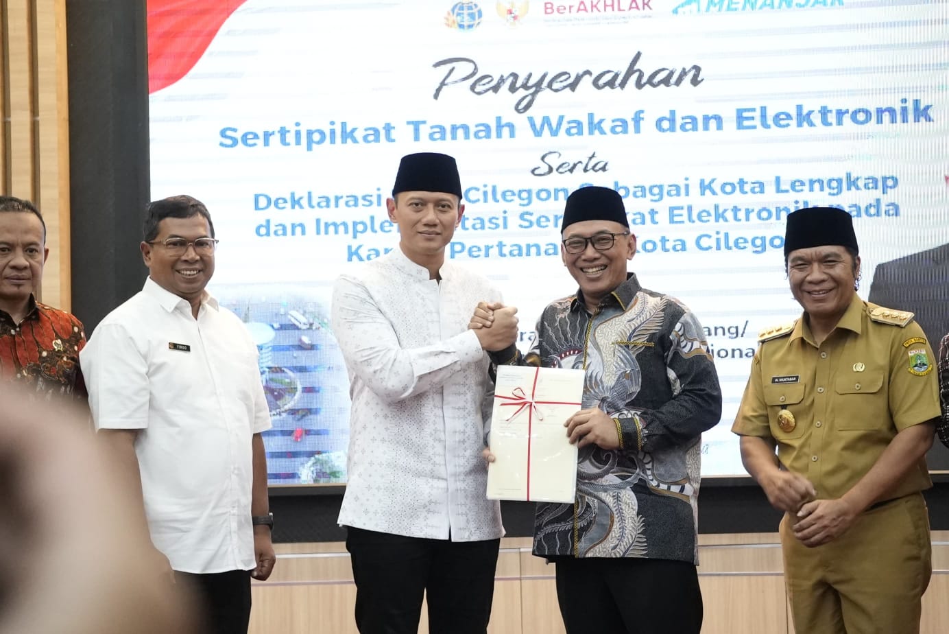 Selain mengakui Kota Cilegon sebagai pionir dalam implementasi sertipikat elektronik, AHY juga turut menyerahkan 53 bidang sertipikat tanah wakaf kepada masyarakat Banten dan 43 bidang sertipikat elektronik kepada perwakilan masyarakat Kota Cilegon.