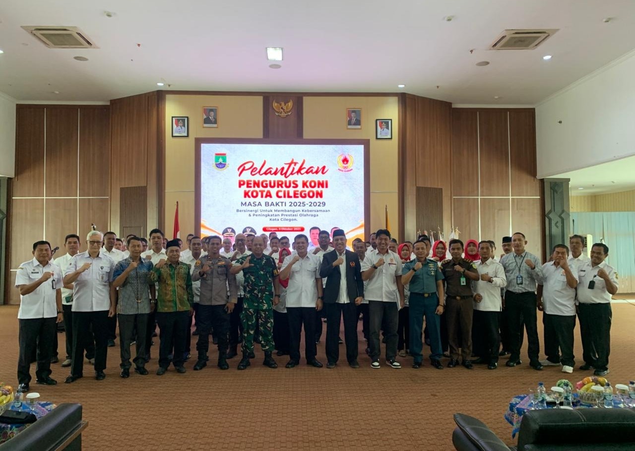 Caption: Pengurus KONI Kota Cilegon periode 2025–2029 berfoto bersama usai pelantikan oleh KONI Provinsi Banten di Aula Diskominfo Cilegon, Rabu (8/10/2025). Kepengurusan baru diharapkan mampu mendorong peningkatan prestasi olahraga di tingkat provinsi dan nasional.(Dok.Kominfo) Delik Asia, (Cilegon) | Kepengurusan Komite Olahraga Nasional Indonesia (KONI) Kota Cilegon periode 2025–2029 resmi dilantik oleh KONI Provinsi Banten dalam sebuah seremoni di Aula Diskominfo Cilegon. Irfan Ali Hakim ditetapkan sebagai Ketua Umum, menandai awal baru bagi pengembangan ekosistem olahraga di Cilegon.