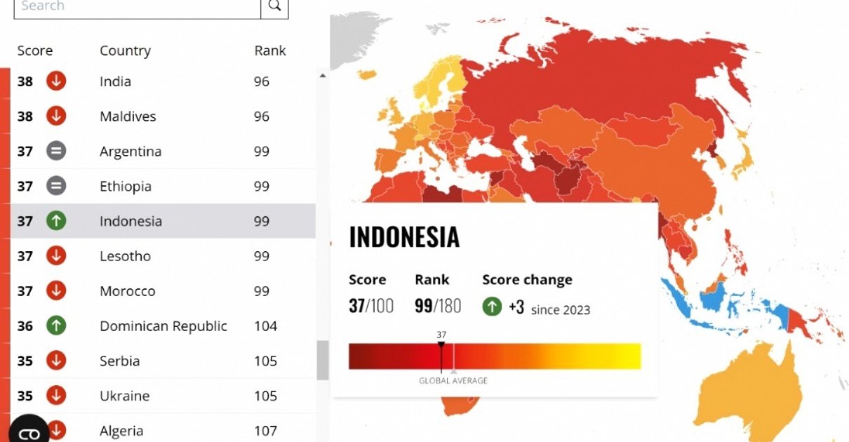 DelikAsia.com, (Jakarta) | Indeks Persepsi Korupsi (IPK) Indonesia tahun 2024 mengalami peningkatan, dengan skor naik menjadi 37/100 dari tahun sebelumnya yang berada di angka 34/100.