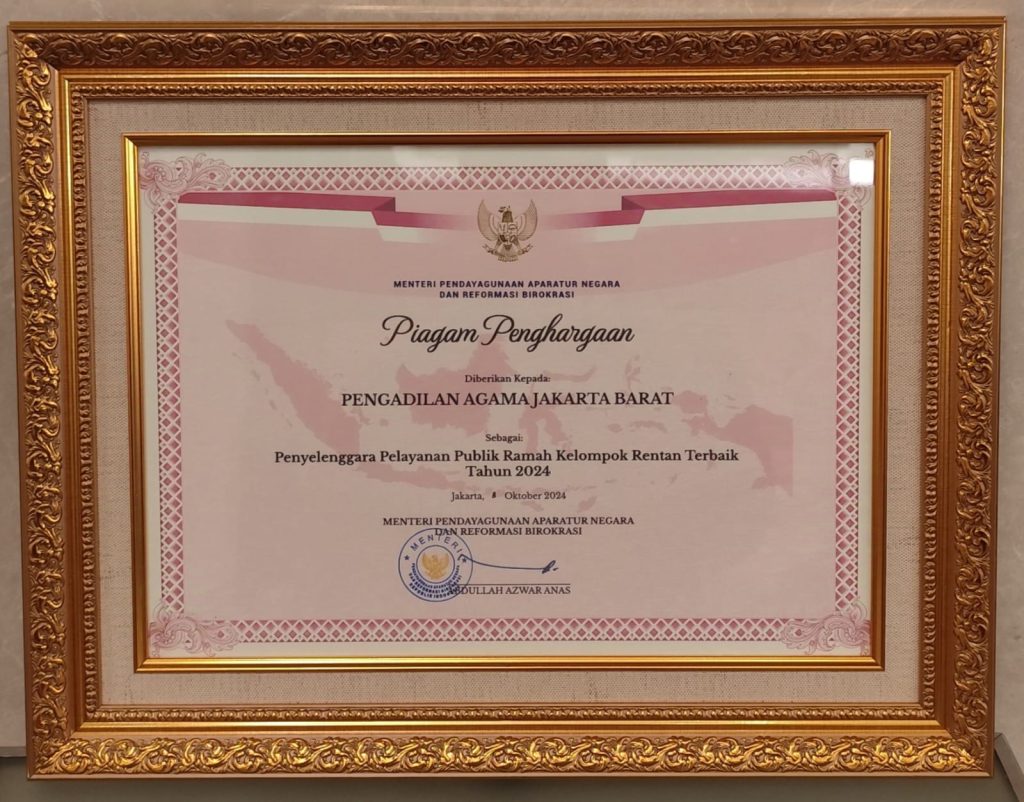 DelikAsia.com, (Jakarta) |Satuan Kerja Pengadilan Agama Jakarta Barat, di bawah Mahkamah Agung, meraih penghargaan sebagai unit penyelenggara pelayanan publik kategori pembinaan pelayanan publik ramah kelompok rentan. Penghargaan ini diberikan oleh Kementerian Pendayagunaan Aparatur Negara dan Reformasi Birokrasi (PANRB) dalam acara Gebyar Pelayanan Prima yang berlangsung di Jakarta pada Selasa, 8 Oktober. Penghargaan ini menegaskan komitmen Mahkamah Agung dalam memberikan pelayanan yang inklusif dan responsif terhadap kebutuhan masyarakat.