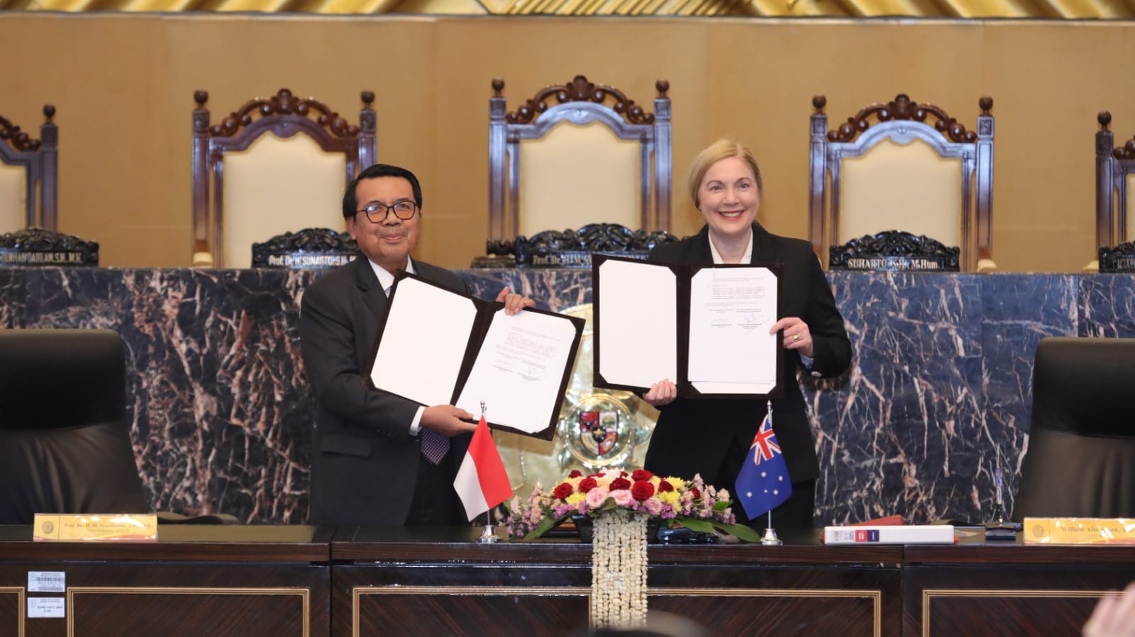 Namun dalam momen penandatanganan ini, Chief Justice Debra Mortimer berhalangan hadir dan menandatangani naskah Nota Kesepahaman lebih dulu dan kehadirannya digantikan oleh Hon. Justice Berna Collier.