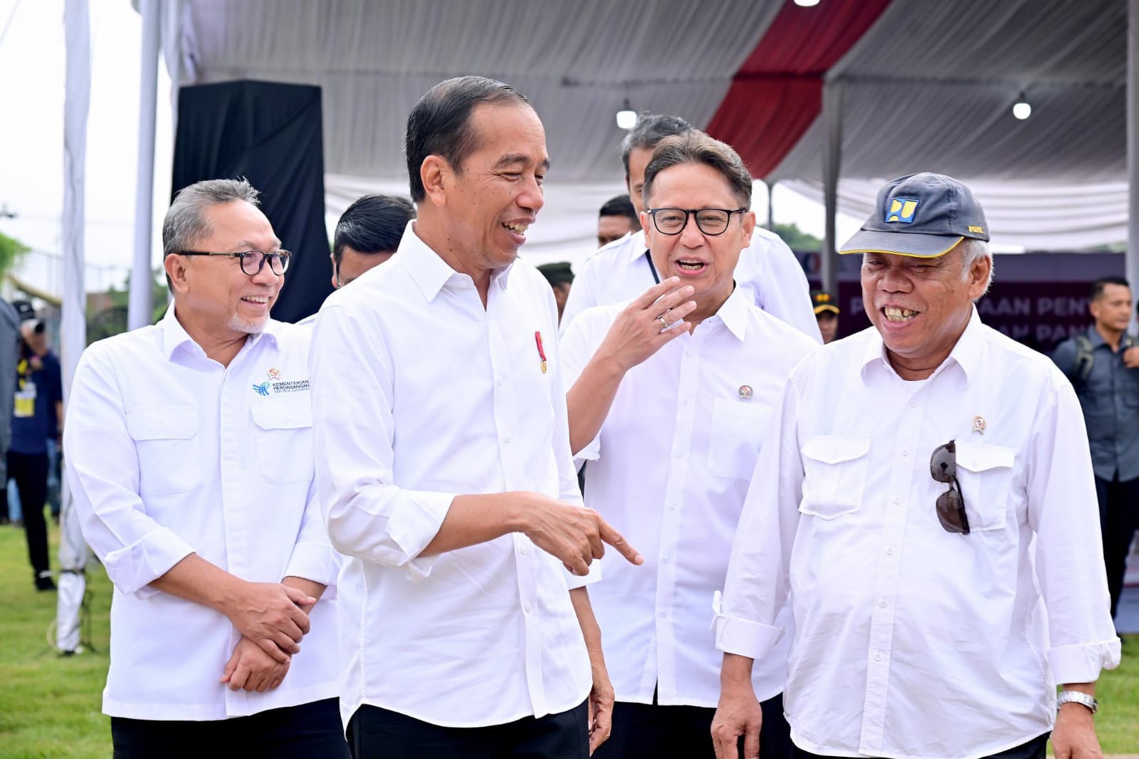 Menteri Perdagangan, Zulkifli Hasan mendampingi Presiden RI, Joko Widodo dalam pelaksanaan penyaluran bantuan pangan cadangan beras pemerintah (CBP) di Salatiga, Jawa Tengah, Senin (22 Jan).