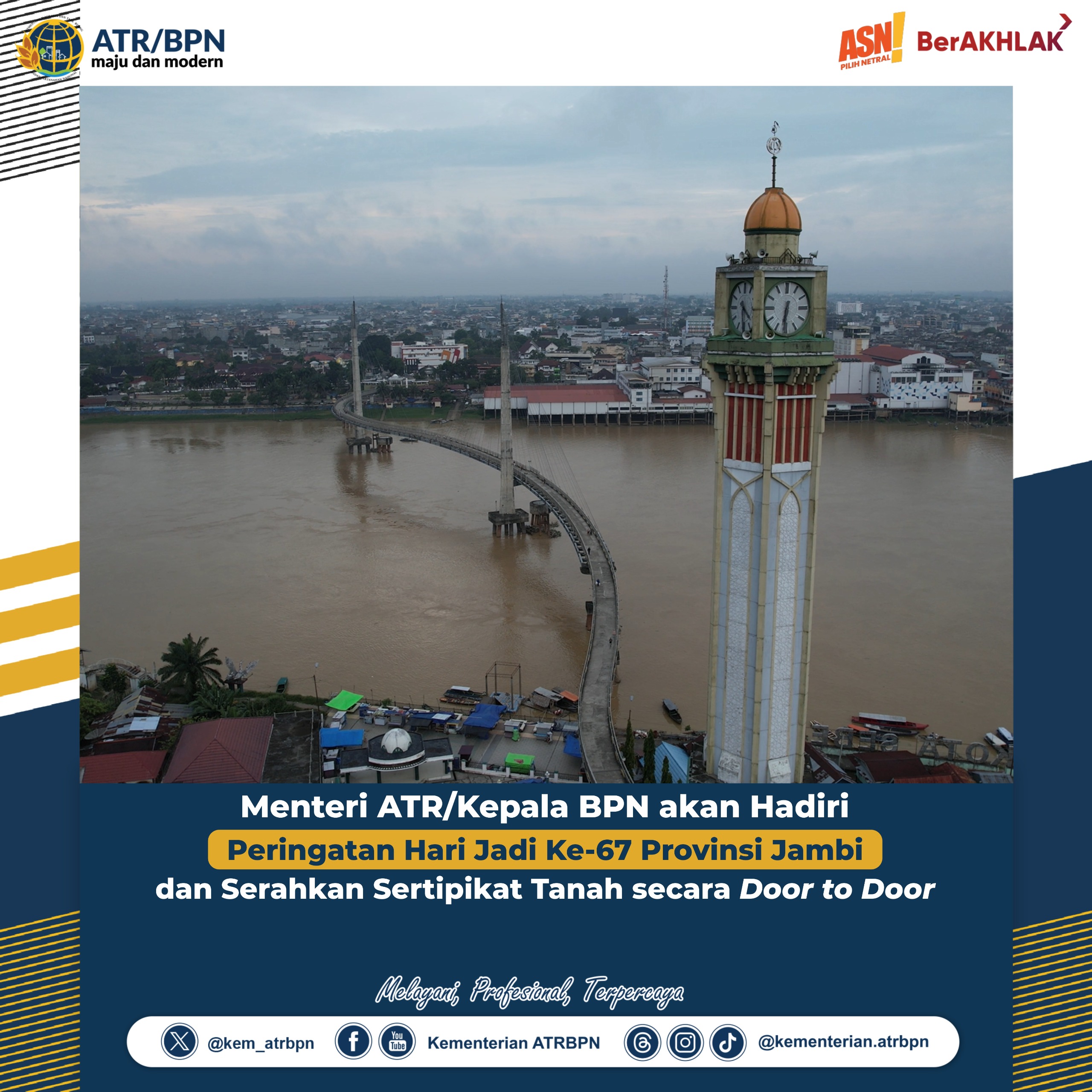 DelikAsia.com, (Jambi) | Menteri Agraria dan Tata Ruang/Kepala Badan Pertanahan Nasional (ATR/BPN), Hadi Tjahjanto akan melakukan kunjungan kerja di Provinsi Jambi pada 5 s.d. 6 Januari 2024. Kali ini, ia diagendakan untuk menghadiri peringatan Hari Jadi ke-67 Provinsi Jambi serta menyerahkan sertipikat tanah hasil program Pendaftaran Tanah Sistematis Lengkap (PTSL) dan Redistribusi Tanah.