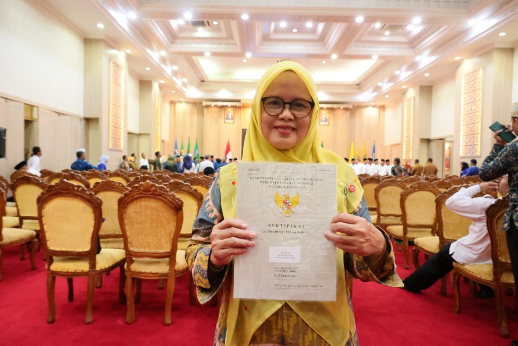 Azizah (54) sebagai Ketua Yayasan Pendidikan Islam Karunia Ibu Kota Tangerang mengaku sangat senang Usai menerima sertipikat tanah wakaf dari Menteri ATR/Kepala BPN. Bagaimana tidak, tempat pendidikan yang ia kelola selama 30 tahun akhirnya mendapat kepastian hukum atas tanah dengan terbitnya sertipikat tersebut.