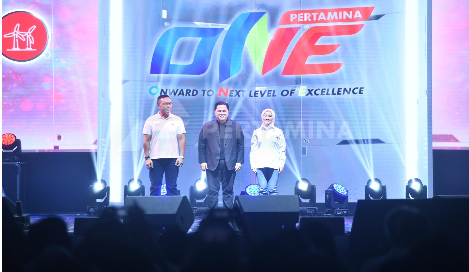 Menteri BUMN Erick Thohir, Komisaris Utama Pertamina Simon Aloysius Mantiri dan Direktur Utama Pertamina Nicke Widyawati berfoto bersama pada acara Perayaan 4 Tahun Pertamina AKHLAK Fest 2024 di Istora Senayan, Selasa (9/7/2024). DelikAsia.com, (Jakarta) | Menteri BUMN Erick Thohir menyebutkan bahwa persaingan tingkat global akan semakin menantang. Menurutnya, ke depan transisi energi akan banyak dinamika luar biasa, untuk itu sebagai korporasi harus siap beradaptasi yang dimulai dari perbaikan manusianya sendiri.