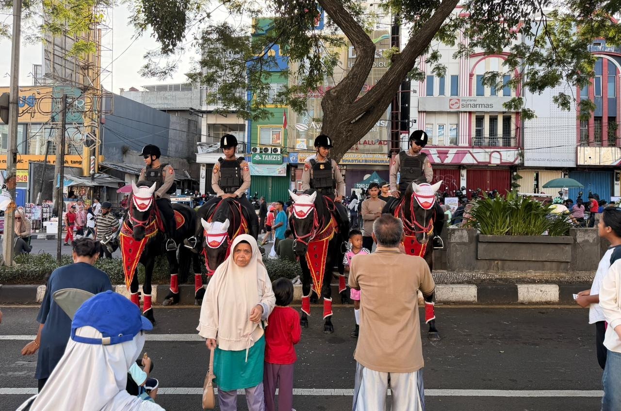 Delik Asia, (Depok) | Detasemen Turangga Direktorat Polisi Satwa (Ditpolsatwa) Korps Sabhara Baharkam Polri kembali menunjukkan komitmennya dalam melayani dan mengamankan kegiatan masyarakat dengan melaksanakan patroli berkuda di area Car Free Day (CFD) Jalan Margonda Raya, Kota Depok, pada Minggu, 26 Oktober 2025.