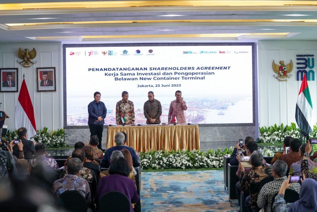 Jakarta, (LN) | PT Pelabuhan Indonesia (Persero) (Pelindo) melalui cucu usahanya, PT Prima Terminal Petikemas (Prima TPK), dan konsorsium yang dibentuk oleh Indonesia Investment Authority (INA) bersama dengan DP World FZE (DP World), yaitu PT INA DPWorld Investment (INA DPWorld), hari ini melaksanakan Penandatanganan Perjanjian Pemegang Saham (Shareholders Agreement/SHA) untuk pendirian Perusahaan Patungan yang akan melakukan pengembangan pasar dan pengoperasian Belawan New Container Terminal (BNCT), dalam rangka memperkuat infrastruktur pelabuhan Indonesia.
