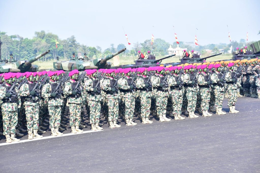 Delik Asia, (Bandung Barat) | Prajurit Petarung Pasmar 1 menunjukkan penampilan gagah di hadapan Presiden Republik Indonesia H. Prabowo Subianto yang menjadi Inspektur Upacara (Irup) pada Upacara Gelar Pasukan Operasional dan Kehormatan Militer yang digelar di Lapangan Udara Suparlan Pusdiklatpassus Batujajar, Bandung Barat, Minggu (10/08/2025).