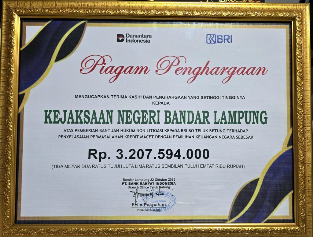Dalam kesempatan tersebut, PT BRI Branch Office Teluk Betung memberikan apresiasi dan piagam penghargaan kepada Bidang Datun Kejari Bandar Lampung di bawah komando Kajari Baharuddin, S.H, M.H melalui Kasi Datun, Bambang Irawan, S.H, M.H atas kerjasama yang dilakukan berupa bantuan hukum non litigasi dengan surat kuasa khusus (SKK) penanganan kredit macet pada nasabah PT BRI Branch Office Teluk Betung, dan JPN Kejari Bandar Lampung berhasil memulihkan keuangan negara sebesar Rp.3.207.594.000, – (tiga milyar dua ratus tujuh juta lima ratus sembilan puluh empat ribu rupiah). Ini merupakan pemulihan tertinggi se-wilayah Kejati Lampung dalam penanganan kredit macet sektor Perbankan.