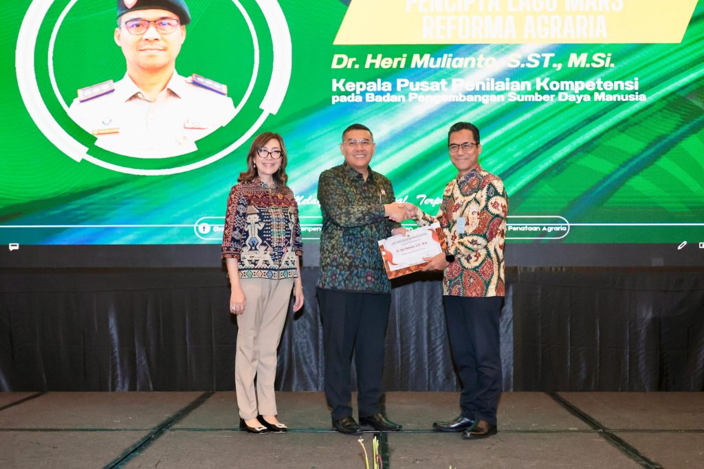 Dalam kegiatan yang sama, Wamen Ossy turut memberikan penghargaan kepada Heri Mulianto, pencipta Mars Reforma Agraria yang juga menjabat sebagai Kepala Pusat Penilaian Kompetensi, Badan Pengembangan Sumber Daya Manusia (BPSDM) Kementerian ATR/BPN.