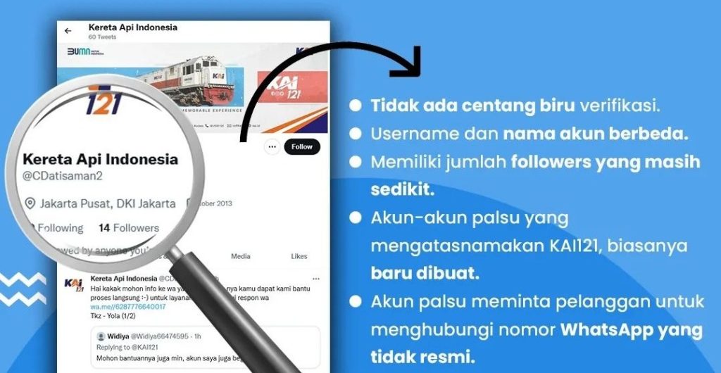 Akun media sosial palsu yang mengatasnamakan KAI tersebut tidak memiliki centang biru verifikasi dan jumlah followersnya masih sedikit. Akun tersebut juga kerap meminta korban menghubungi nomer WhatsApp yang tidak resmi atau pribadi dan meminta data-data pribadi pelanggan.