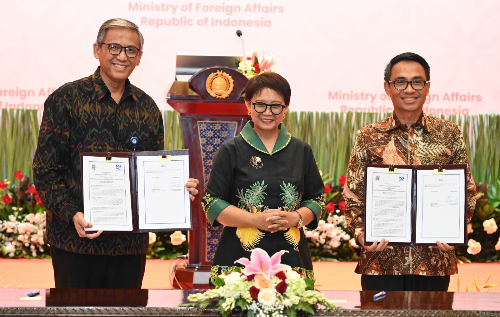 Sementara itu, penandatangan Nota Kesepahaman Kemlu dengan PT. Pos Indonesia dilakukan antara Sekjen Kemlu dengan Direktur Utama PT. Pos Indonesia, dengan disaksikan oleh Menteri Luar Negeri.