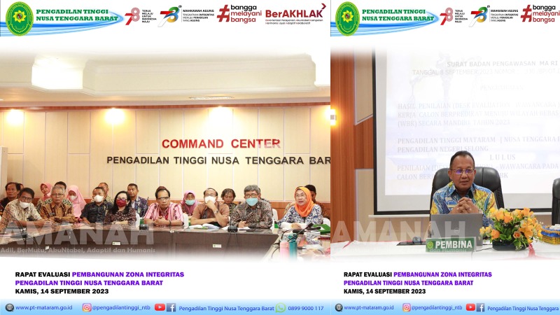 NTB, (DelikAsia.com) | Dalam rangka menguatkan internalisasi Pembangunan Zona Integritas bagi seluruh warga peradilan Pengadilan Tinggi NTB , Pengadilan Tinggi NTB melaksanakan rapat evaluasi Pembangunan Zona Integritas yang diikuti oleh Seluruh Hakim Tinggi dan Hakim Ad Hoc, Panitera, Sekretaris, Pejabat Struktural dan Fungsional , Pelaksana dan PPNPN Pengadilan Tinggi NTB pada Kamis pagi, 14 September 2023 di Ruang Command Center Lantai 2 Pengadilan Tinggi NTB.