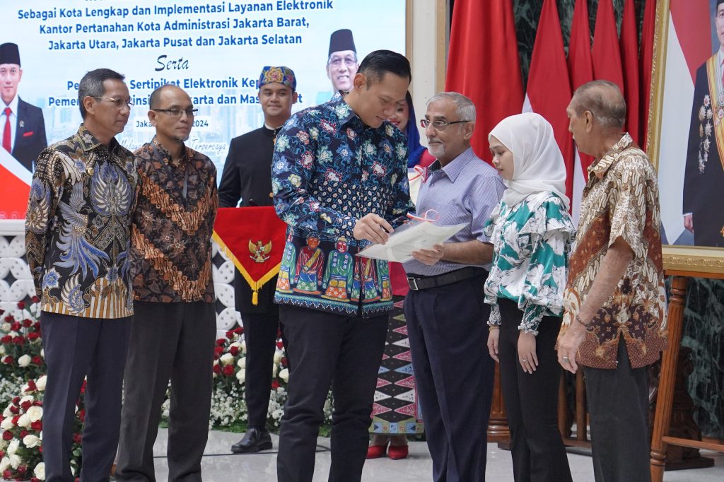 Seperti yang baru saja dilakukan oleh Menteri AHY dalam kesempatan yang sama, yaitu me-_launching Layanan Elektronik di Kantor Pertanahan Kota Administrasi Jakarta Barat, Jakarta Utara, Jakarta Pusat, dan Jakarta Selatan. Ia pun sekaligus menyerahkan sebanyak 703 Sertipikat Tanah Elektronik. Sertipikat tersebut diserahkan kepada Pemerintah Provinsi DKI Jakarta sebanyak 700 sertipikat dan 3 (tiga) Sertipikat Tanah Elektronik lainnya untuk masyarakat yang berdomisili di Kota Administrasi Jakarta Utara, Jakarta Pusat, dan Jakarta Barat.