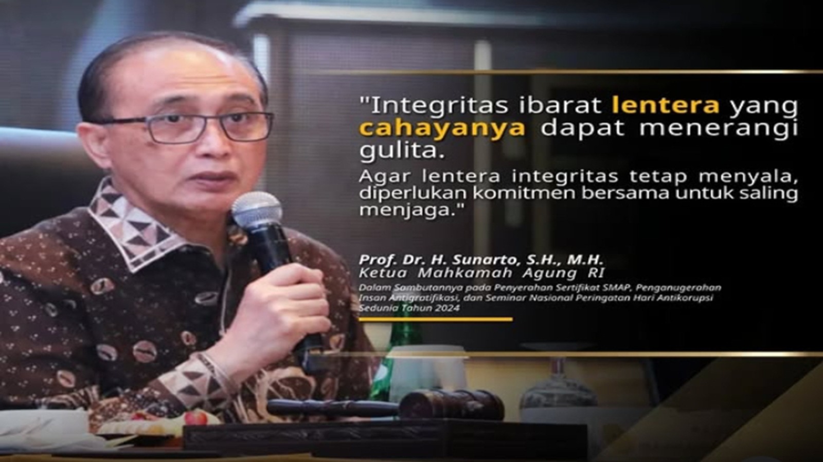 Rangkaian kegiatan HAKORDIA diisi dengan penyerahan sertifikat SMAP 2024, penganugerahan Insan Anti Gratifikasi, dan seminar nasional. Ketua Mahkamah Agung, Prof. Dr. Sunarto, SH, MH, menegaskan pentingnya integritas sebagai pondasi utama. “Integritas ibarat lentera yang cahayanya dapat menerangi gulita. Agar lentera integritas terus menyala, diperlukan komitmen bersama untuk saling menjaga,” ungkapnya.