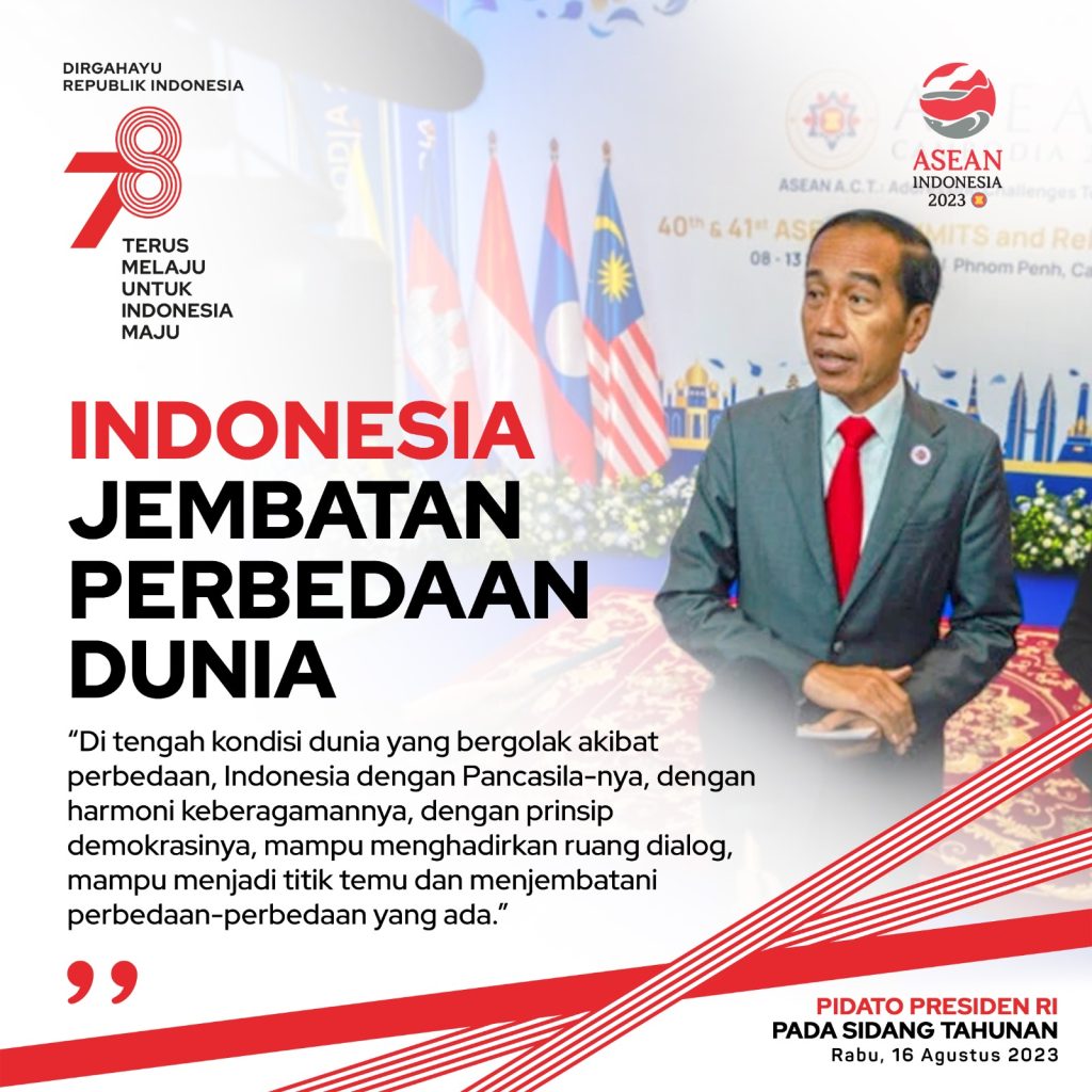“Indonesia dengan Pancasila-nya, dengan harmoni keberagamannya, dengan prinsip demokrasinya mampu menghadirkan ruang dialog, mampu menjadi titik temu dan menjembatani perbedaan- perbedaan yang ada,” tandas Presiden RI Joko Widodo.