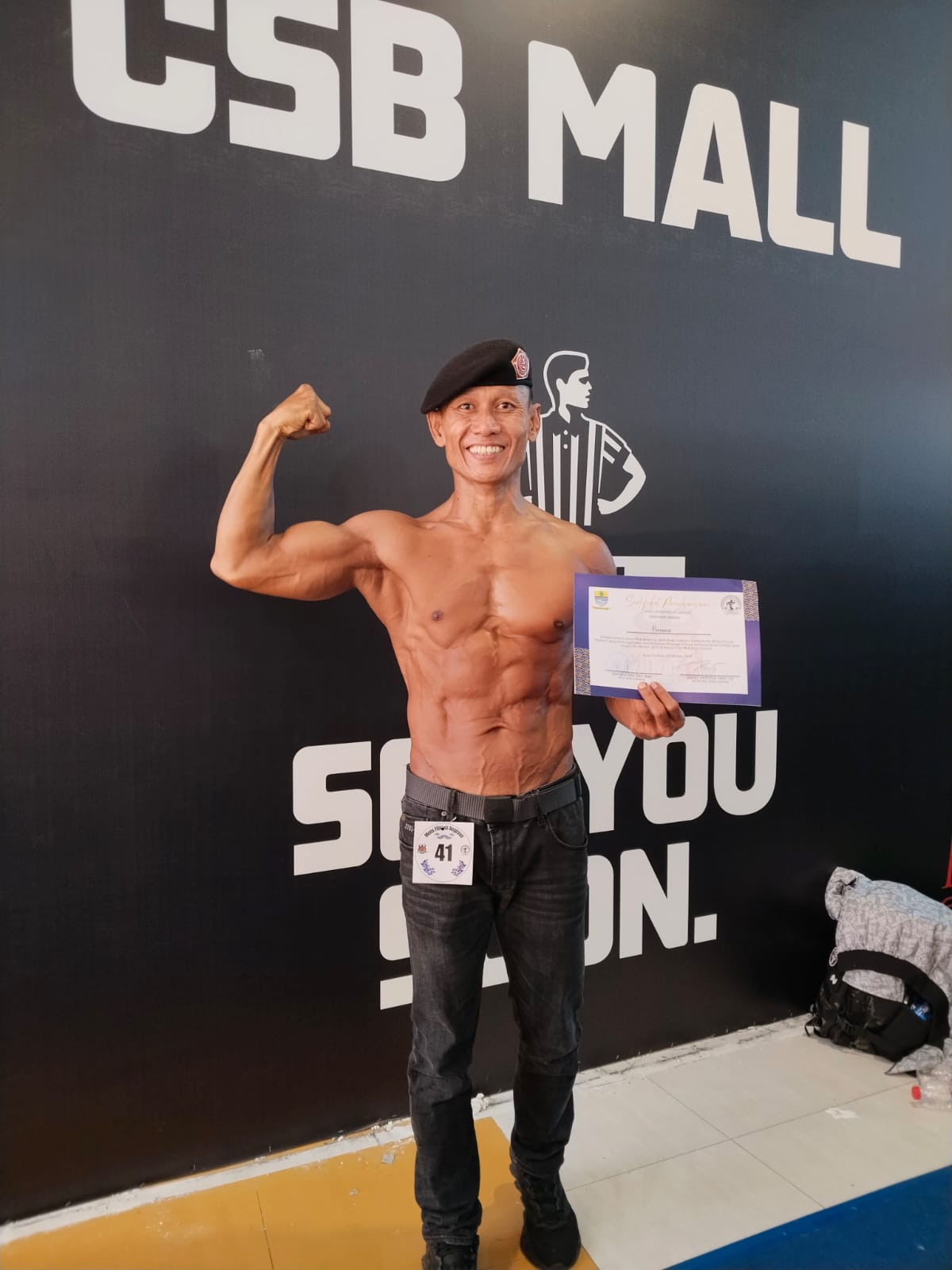 Dengan penampilan penuh percaya diri dan tubuh berotot proporsional, Purnomosidi sukses tampil memukau di atas panggung.