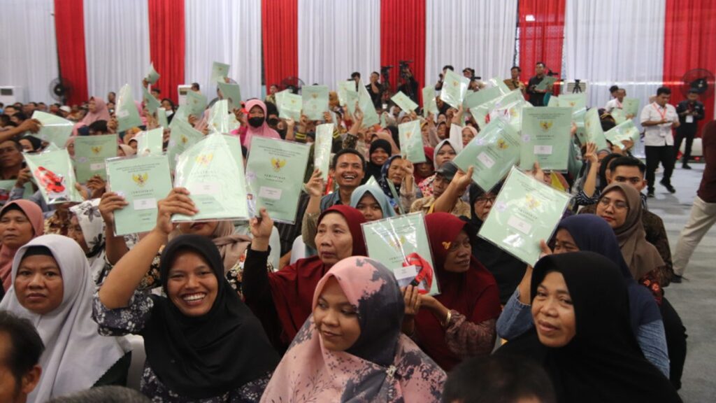 DelikAsia.com, (Cilacap) | Presiden Republik Indonesia, Joko Widodo didampingi Menteri Agraria dan Tata Ruang/Kepala Badan Pertanahan Nasional (ATR/BPN), Hadi Tjahjanto menyerahkan 2.000 sertipikat tanah, bertempat di GOR Premium Pertamina Cilacap, Selasa, (02/01/2023). Sertipikat yang diserahkan kali ini terdiri dari 1.122 sertipikat hasil program Pendaftaran Tanah Sistematis Lengkap (PTSL) kepada masyarakat di Kabupaten Cilacap dan Banyumas, serta 878 Sertipikat hasil Redistribusi Tanah kepada masyarakat di Kabupaten Cilacap yang bersumber dari Tanah Timbul.