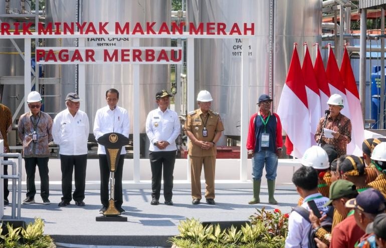 Caption: Presiden Joko Widodo, saat resmikan Pabrik Minyak makan merah.[Sumber: Humas Kementerian Koperasi dan UKM] DelikAsia.com, (Medan) | Pabrik Minyak Makan Merah Pagar Merbau, di Kabupaten Deli Serdang, Sumatera Utara (Sumut), yang dikelola koperasi sebagai bentuk inisiatif Kementerian Koperasi dan UKM (KemenKopUKM) melalui kemitraan antara Koperasi Pujakesuma dengan PT PTPN II diresmikan Presiden Joko Widodo (Jokowi), Kamis (14/3/2024).