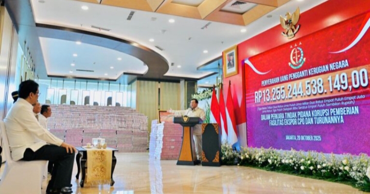 Hal tersebut disampaikan Kepala Negara saat menyaksikan Penyerahan Uang Pengganti Kerugian Negara sebesar Rp13.255.244.538.149,00 dalam perkara tindak pidana korupsi pemberian fasilitas ekspor Crude Palm Oil (CPO) dan turunannya dari Kejaksaan Agung kepada Kementerian Keuangan, di Gedung Utama Kompleks Kejaksaan Agung RI, Jakarta, pada Senin, 20 Oktober 2025.