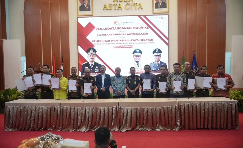 Makassar, (Delik Asia) | Kejaksaan Tinggi Sulawesi Selatan (Kejati Sulsel) bersama Pemerintah Provinsi Sulawesi Selatan (Pemprov Sulsel) melakukan penandatangan Nota Kesepahaman (MoU) tentang penerapan pidana kerja sosial (Social Service Order) bagi pelaku tindak pidana di Baruga Asta Cita, Rumah Jabatan Gubernur Sulawesi Selatan, Kamis (20/11/2025).